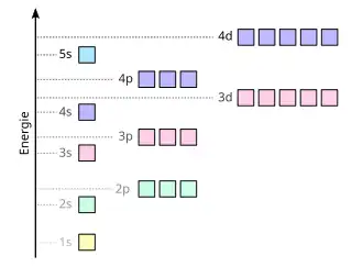 Energetické hladiny atomu (uspořádání elektronů uvnitř elektronového obalu) popisuje elektronová konfigurace atomu. Předpokládá se, že se elektrony převážně vyskytují v prostoru, který se nazývá atomový orbital (s, p, d, f). Energie orbitalu a vzdálenost orbitalu od atomového jádra je popsána hlavním kvantovým číslem n.[1]