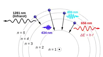 kde (také se používá značka ) je frekvence fotonu, je energie elektronu v počátečním stavu (stav s kvantovým číslem ) a je energie elektronu v konečném stavu (stav s kvantovým číslem ). Pohybuje-li se tedy elektron po stabilní dráze, nevyzařuje podle druhého postulátu žádné záření, při přechodu mezi jednotlivými drahami však dojde k vyzáření nebo pohlcení energetického kvanta, jehož velikost určuje právě uvedený vztah.