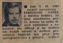 V listu Rudé právo se 7. října 1989 objevil drobný inzerát s přáním k narozeninám „Ferdinandu Vaňkovi z Malého Hrádku“, které měl oslavit 5. října a který byl doplněn Havlovou fotkou, což komunistické cenzuře uniklo. Podal jej Petr Rýgr, fanoušek dramatikových děl. Toto číslo deníku bylo díky vysokému zájmu veřejnosti rychle rozprodáno a Rýgr se dostal do hledáčku Státní bezpečnosti.[1]