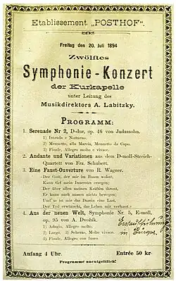 Antonín Dvořák přijel do Karlových Varů v roce 1879 a byl nadšen provedením své Smyčcové serenády E-dur, takže později dal souhlas k tomu, aby se karlovarský orchestr ujal evropské premiéry Symfonie č. 9, e-moll, op. 95, „Z nového světa“. Ta se konala s velkým úspěchem 20. července 1894.