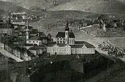 Veduta obléhání Brna roku 1645, pohled na kostel sv. Jakuba a klášter -