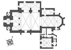 Kostel je trojlodní, uvnitř nečleněný, sklenutý křížovými klenbami. Na západní straně je kruchta nesená třemi oblouky opět křížově podklenutá.[7]