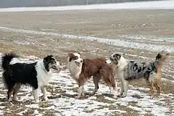 ![]() Australští ovčáci různých zbarvení tricolor, red merle, blue merle, red tricolor (zleva doprava) | |