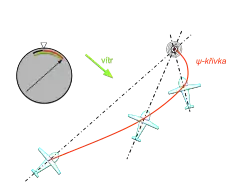 Zakřivení trajektorie letu způsobené bočním snosem větru.