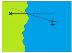 Lom radiových vln na rozhraní moře/pevnina. Navigační maják má zdánlivě jiný směrník.