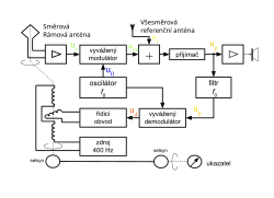 Blokové schéma automatického radiového kompasu. Zobrazuje způsob analogového zpracování signálu z obou antén (směrové rámové a všesměrové referenční antény). Barevně jsou označeny signály v jednotlivých fázích určení směru.