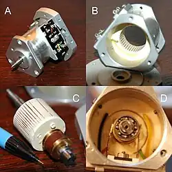 Letecký Goniometr ARK.  (A) - Kompletní goniometr, (B) - Stator, (C) - Rotor, (D) - Sběrné kartáče.