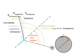 Navigační veličiny poskytované ARK. Směrník majáku je označen zeleně. Jak kurs letadla, tak i směrník majáku mohou být vztaženy k magnetickému, zeměpisnému, nebo kompasovému severu.