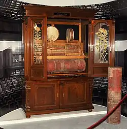 Klavírový orchestrion s bubny, činely a ozvučnými dřívky
