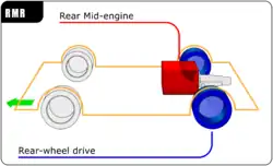 Označuje se zkratkou RMR a často se o něm hovoří jako o klasické či základní koncepcí (zřejmě proto, že první automobil ji využíval). Případ této koncepce nastává tehdy, když je motor uložený před zadní nápravou a hnaná jsou zadní kola. Tuto koncepci využívá mnoho automobilů: Lamborghini Miura, Lamborghini Countach, Lamborghini Diablo, Ferrri 458 Italia, Ferrari Enzo, Ferrari F50, Ferrari F40, Koenigsegg Agera, Pagani Zonda...