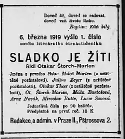 - ↑ Národné noviny, 11.3.1919,s.4, Inzerát a autoři 1. čísla Sladko je žíti