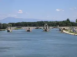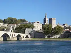 - Avignonský most (Pont Saint-Bénezet) z poloviny 14. století je patrně nejznámějším symbolem města. Most původně dlouhý 900 metrů s 22 oblouky strhla v 17. století povodeň, takže jeho zbylé čtyři oblouky končí v půli řeky Rhôny. Na most se vstupuje věží Tour du Châtelet a na jednom z pilířů je goticko-románská patrová kaple Chapelle Saint-Nicolas.