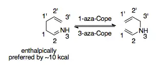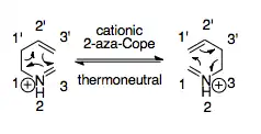Jak 1-, tak i 3-aza-Copeovy přesmyky probíhají převážně přes meziprodukty s židličkovými konformacemi (a zachovává se při nich stereochemie, podobně jako u kationtových 2-aza-Copeových přesmyků), lze je urychlit pomocí zavedení kladných nábojů, což dodává meziproduktům více diradikálové a dipolární vlastnosti.[29] 3-aza-Copeovy přesmyky (a tedy i 1-aza-přesmyky, které probíhají přes stejné přechodné stavy) by tak měly mít méně aromatické přechodné stavy než obecné Copeovy přesmyky a kationtové 2-aza-Copeovy přesmyky, což vede k vyšším reakčním teplotám (blízkým teplotám využívaným u Copeových přesmyků i vyšších, mezi 170 a 300 °C) potřebným k překonání kinetických aktivačních bariér.[3][29][30]