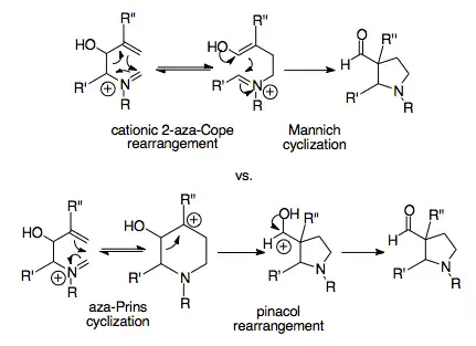 Hlavní produkt reakce může vznikat dvěma různými způsoby: aza-Copeovou/Mannichovou reakcí a aza-Prinsovou cyklizací s pinakolovým přesmykem. Tyto mechanismy mají rozdílné stereochemické vlastnosti, čímž lze vysvětlit převahu aza-Copeova/Mannichova mechanismu. Při aza-Copeově/Mannichově reakci každý atom v analogu [1,5] dienu podléhá sp2 hybridizaci, čímž naruší stereochemii reaktantu na pozici R', zatímco u aza-Prinsovy reakce s pinakolovým přesmykem zůstává stereochemie na tomto místě zachována; díky tomu je možné pomocí jednoduchého testu zjistit, který mechanismus převažuje. U enantiomerně čistého výchozího materiálu v pozici "R'" bude vznikat racemická směs, pokud je převažujícím mechanismem aza-Copeova/Mannichova reakce, zatímco při převaze aza-Prinsovy cyklizace s pinakolovým přesmykem by stereochemie měla být zachována. Zda je produkt racemický, lze ověřit jednoduše, díky čemuž se dá ověřit, že převažujícím mechanismem je aza-Copeova/Mannichova reakce. Tato skutečnost byla ověřena tím, že účinnost tvorby karbeniového iontu při aza-Prinsově/pinakolovém mechanismu by bylo možné zvýšit stabilizací kladného náboje vhodným substituentem, který by pozměnil reaktivitu při tomto průběhu. Bylo vyzkoušeno několik různých substituentů a zjistilo se, že jejich vliv na výsledek reakce je malý, což také ukazuje na převahu aza-Copeova/Mannichova mechanismu.[14] Aza-Prinsův/pinakolový mechanismus se projevuje pouze při výrazně navýšené nukleofilitě alkenu a elektrofilitě iminu.[1][6][17]