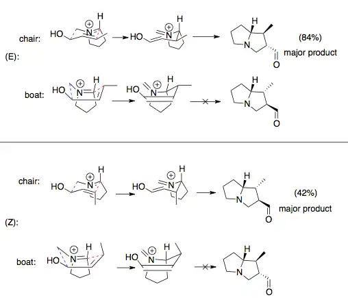 Na stereochemii aza-Copeových/Mannichových reakcí použitých v anulačních reakcích má vliv meziprodukt s židličkovou konformací, který způsobuje, že objemné substituenty se obvykle navážou kvaziekvatoriálně. Vinylové a aminové skupiny mohou reakci řídit podle toho, zda jsou v konfiguraci syn- nebo anti. Velký vliv mívají aminové skupiny, u kterých velké substituenty vedou k tvorbě syn-produktů. U reaktantů s anti vinylovými a aminovými substituenty vzniká jediný přechodný stav, vedoucí ke vzniku cis cyklických sloučenin, zatímco v případě syn substituentů mohou vznikat různé meziprodukty v závislosti na sterických interakcích s rozpouštědlem nebo velkými dusíkatými substituenty, u nichž může dojít ke změnám konfigurace přechodného stavu.[12][13]