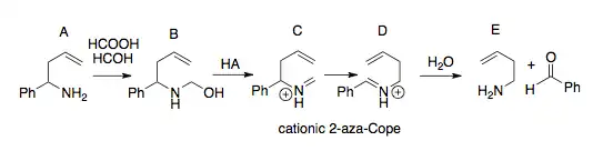 První 2-aza-Copeův přesmyk byl popsán v roce 1950, a to při neúspěšném pokusu o přípravu aminoalkoholu.[2] This discovery identified the basicByl určen základní mechanismus přesmyku podle toho, že produkt se pravděpodobně vytvořil při dusíkatém ekvivalentu Copeova přesmyku. Reakcí allylbenzylaminu (A) s kyselinou mravenčí a formaldehydem vznikl aminoalkohol (B). Aminoalkohol se adicí kyseliny přeměnil na imin (C), u kterého proběhl kationtový 2-aza-Copeův přesmyk (D). Hydrolýzou iminiového iontu vznikl amin (E). Při reakci výchozí látky se samotným formaldehydem po přesmyku docházelo k alkylaci aminové skupiny.[2]