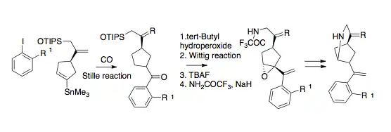 Kyanomethylové skupiny jsou snadným způsobem ochrany iminiových iontů během allylové vinylace ketonů. Kyanamidové skupiny a jejich analogy se při přípravě iminiových iontů využívají často. Obvykle se navazují prostřednictvím nukleofilních adicí na iminium, nejčastěji alkylací aminu formaldehydem. Iminiový ion je tak stíněn.[26] Použití kyanomethylových skupin umožňuje snadné řízení aza-Copeovy/Mannichovy reakce. Kyanomethyl chrání dusík v pozici 2 v průběhu tvorby dalších allylových analogů. Následně představuje dobrou odstupující skupinu při vzniku iminiového iontu.[27]