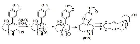 Vznik iminiových iontů z kyanomethylových skupin se obvykle spouští přídavkem dusičnanu stříbrného, lze však také použít i jiné sloučeniny stříbra a nebo mědi. Tímto způsobem lze řídit tvorbu iminiových iontů s ještě větší přesností.[6][27] Uvedené reakce se musí provádět za teplot okolo −78 °C, aby nedocházelo ke vzájemnému působení mezi kyanomethyly a vinyllithiem. Tato metoda umožňuje využití mnoha různých dusíkatých substituentů a může být použita ke zjednodušení syntézy oktahydroindolů a pyrrolů.[1][27]