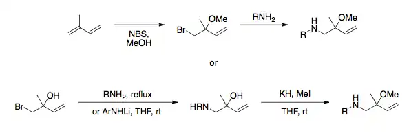 Díky úhlovému napětí lze na molekuly epoxidů snadno navázat aminové skupiny dva atomy od alkoholových skupin. Epoxidový kruh je nejdříve otevřen nukleofilním atakem bromidu; jako nukleofily mohou rovněž sloužit primární nebo aromatické aminy či lithné anilidy. Po tomto kroku se často provádí O-methylace, čímž se naváže chránicí skupina.