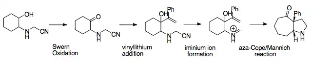 Overmanovu syntézu strychninu lze považovat za dobrý příklad přípravy prekurzorů potřebných pro aza-Copeovu/Mannichovu reakci, protože se jedná o účinné využití otevírání epoxidového kruhu. Hlavní kroky syntézy substrátu zahrnují Stilleovu reakci, při níž se spojí dva prekurzory, epoxidaci dvojné vazby terc-butylhydroperoxidem, Wittigovu reakci sloužící k přeměně ketonu na alken, a cyklizaci. Následně se provede alkylace aminu (není znázorněna), čímž se vytváří substrát pro přesmyk. Tento postup se vyznačuje enantioselektivitou podobnou jako u aza-Copeovy/Mannichovy reakce, protože je konfigurace konečného produktu určena konfigurací výchozí látky: který enantiomer strychninu se vytvoří, je určeno enantiomerem výchozího materiálu.[18][19]