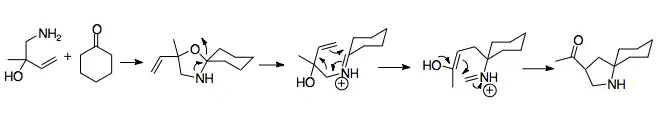 Jako substráty přesmyku lze použít i vinyloxazolidiny. Nejprve se tvoří vinyloxazolidin atakem aminobutenolu na cyklohexanon a následně dojde při zahřívání za přítomnosti kyseliny (Lewisovy nebo protické) aza-Copeova/Mannichova reakce. Poté proběhne rozpad cyklu a tvorba pětičlenného kruhu. Další možností je navázání oxazolidinu na další kruh.[22]