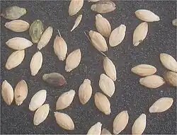 Plod je oválně vejčitá, bělavě žlutá až žlutohnědá, pluchatá, zašpičatěná, lesklá obilka dlouhá průměrně 2 mm a široká 1 mm. Jedna statná rostlina vyprodukuje až 2000 obilek, v 1 g jich je přibližně 240 kusů a HTS je udávána 4,2 gramy. Klíčivost si podržují semena uložená v suchu až sedm roků a v půdě běžně přes pět let.[1][2][6][7][8][9][10]