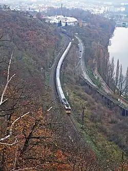 ![]() Holešovický železniční most s navazujícím tunelem pod Bílou skalou, dlouhým 331 m. Pohled od západu z mostu Barikádníků | |