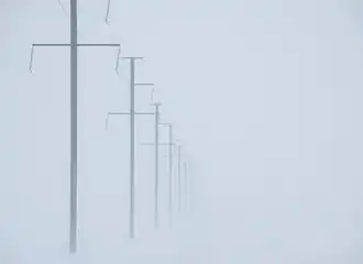 Sloupy elektrického vedení podél silnice, Saskatchewan, Kanada.