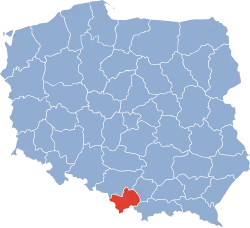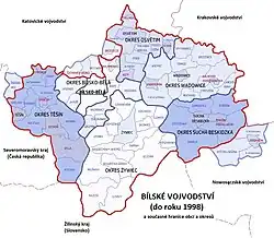 Roku 1998 bylo jeho území rozděleno mezi Slezské (Bílsko-Bělá, Těšín, Żywiec) a Malopolské vojvodství (Osvětim, Sucha Beskidzka, Wadowice).