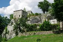 Vnější stěny byly postaveny z pečlivě osazeného vápence a vnitřní části byly postaveny z kamenné suti zaplavené velkým množstvím vápenné malty. Na východní straně ke skále přiléhal hospodářský dvůr, bráněný kónickým zemským náspem s oválnou věží a suchým příkopem. Z jihu byl hrad zajištěn kamennou zdí, jejíž zbytky jsou dodnes patrné. Přístup na hrad byl možný pouze cestou přes celý systém nástupišť a žebříků. Navzdory své výhodné poloze a poměrně silnému opevnění, díky kterému bylo prakticky nemožné se dostat na hrad pomocí středověkých obléhacích technik, nehrál v historii důležitější roli.