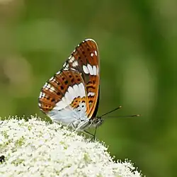 Malé tmavé skvrny na spodní straně křídla jsou snadno rozpoznatelné, protože mají oranžově hnědou základní barvu. Dominantní je bílý pás jemně lemovaný černou. Na vnějším okraji a také na spodní části křídel jsou další bílé oblasti, někdy ohraničené tmavými skvrnami.