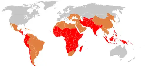 Břišní tyfus je rozšířený ve všech zemích s teplým klimatem a nízkým hygienickým standardem. Celosvětově je odhadován výskyt onemocnění na 16 milionů nových případů ročně a 600 tisíc souvisejících úmrtí. Nakazí se přibližně 1 cestovatel z 25–30 tisíc, na indickém subkontinentu 1 ze 3 tisíců. V průmyslově vyspělých zemích se břišní tyfus stal vzácným onemocněním, a to především díky dobrým hygienickým podmínkám a kvalitnímu zdravotnictví. Většina nových případů v těchto zemích je importována cestovateli nebo imigranty. Problémem zůstává tyfus především v rozvojových zemích Asie, Střední a Jižní Ameriky a Afriky.