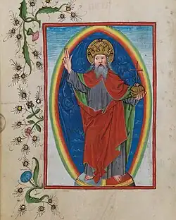 Ve dvanáctém století se ve francouzských rukopisech a v anglických kostelních vitrážích začala objevovat vyobrazení Boha Otce, v podstatě založená na Věkovitém z knihy Daniel. Ve 14. století byla ilustrovaná Bible neapolská opatřena vyobrazením Boha Otce v hořícím keři. V 15. století obsahovala Rohanská kniha hodinek vyobrazení Boha Otce v lidské podobě nebo antropomorfní zobrazení. Ve východním pravoslavném umění zůstává toto zobrazení vzácné a často kontroverzní, v době renesance se umělecká zobrazení Boha Otce volně používala v západní církvi.[80]