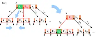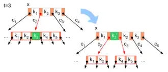 - Do tohoto společného potomka následně přesuneme i klíč který je odděloval v rodiči (na ilustrativním obrázku zelený klíč k1)