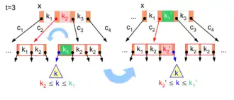 - Data v uzlu jsou organizována tak, aby logicky vytvářela posloupnost , kde k označují klíčové atributy ukládaných dat, takové, že pro ně jde zavést relace uspořádání <, a označují odkazy na podstromy. Pro každé je