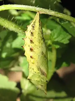Housenky před zakuklením vyhledávají potenciální úkryt (pod kamenem, ve štěrbinách zdí), kde se následně kuklí jednotlivě do různě barevných kukel, což je dáno neuroendokrinními faktory. Stádium kukly je krátké.[1] V jiných případech se housenky zakuklí přímo na živné rostlině.[4] Kukly jsou většinou pak zavěšené a dle závislosti na úkrytu se mění i barva kukly. Pokud se housenka zakuklí na rostlině, mívá kukla barvu žlutozelenou s červenohnědými proužky a lesklými skvrnami. V případě, že došlo k zakuklení v štěrbině či pod kamenem, je kukla hnědošedá se zlatými skvrnami na hřbetě.[4]