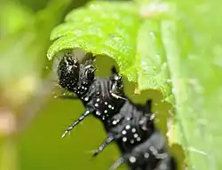 Po vylíhnutí z vajíček žijí housenky babočky společně a na jedné rostlině se tak často vyskytuje až několik desítek jedinců.[2] Housenka je černá hustě posetá bílými skvrnami s černými trny. Panožky mají červené a hlava je černě lesklá.[4] Housenka se během vývoje téměř nemění.[4] z kopřivy získává dostatek potravy a opouští ji až v době dospělosti (tj. jako imago). Prochází dokonalou přeměnou.