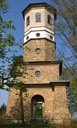 Věž je kamenná, v empírovém stylu a má čtyřhranný půdorys, vyšší patra jsou osmistěnná. Uvnitř věže jsou dubové kruhové schody, po kterých se vystoupá až do 18 metrů, kde je místnost s okny a zdobeným stropem. Strop je vyzdoben motivy ze zvěrokruhu. Původně měla být o jedno dřevěné patro vyšší, patro ovšem mělo být v období prusko-rakouských válek v roce 1866 poškozeno a věž snížena.