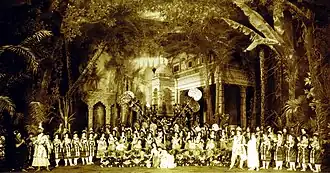 Titulní role chrámové tanečnice Nikiye byla vytvořena pro primabalerínu Jekaterinu Vazem (Екатери́на О́ттовна Ва́зем). Patřil jí také i příjem z premiéry.[7] V dalších hlavních rolích tančil Lev Ivanov (Иванов, Лев Иванович) jako Solor, Maria Goršenkova (Горшенкова, Мария Николаевна) jako Gamsatti, Nikolai Goltz (Гольц, Николай Осипович) jako nejvyšší bráhman a Christian Johansson (Иогансон, Христиан Петрович) jako rádža.[9] V zásnubní scéně druhého dějství vystoupilo 230 tanečníků a kompars.[10] Ve známé scéně „království stínů" ve třetím dějství vystoupilo 64 tanečníků.[11]