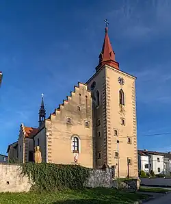 - Morový sloup Nejsvětější Trojice z roku 1727 je dílem Josefa Jiřího Jelínka, se sochami svatých Václava, Vojtěcha a Jana Nepomuckého, hlavními donátory byla hraběnka Markéta, rozená Černínová a hrabě František Arnošt Valdštejn, kteří darovali po 50 zlatých, zbylé finance byly vybrány mezi občany[21]