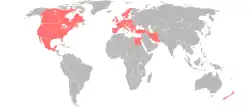 Severní Amerika: Bermudy , Kanada, Mexiko, USA (Alabama, Kalifornie, Colorado, Connecticut, Georgie, Illinois, Maine, Maryland, Michigan, New York, Severní Karolína, Ohio, Oregon, Pensylvánie, Texas, Utah, Virginie, Washington, Západní Virginie, Wisconsin).