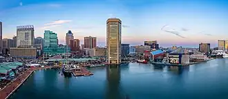 Centrum města reprezentuje Inner Harbor (Vnitřní přístav), v němž se nachází množství restaurací nabízejících kupříkladu tradiční krabí koláčky, turistických atrakcí a mrakodrapů, neboť jde o finanční centrum marylandské metropole.[13] Vnitřní přístav je obklopen několika zachovalými historickými částmi města včetně oblíbeného nábřeží s molem Fell's Point či poklidné čtvrti s krásným výhledem na panorama města Federal Hill.