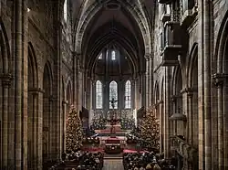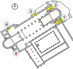 Trojlodní dvouchórová bazilika má východní chór zasvěcený sv. Jiří a pod ním kryptu, západní chór je zasvěcený sv. Petrovi. Čtyři věže kostela dosahují výšky 81 metrů, na západním průčelí je spojuje tzv. westwerk. Vzorem pro západní dvojvěží byly věže katedrály v Laonu.[3]