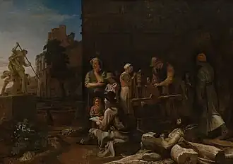 Ačkoli Bamboccianti byli se svými malbami úspěšní, teoretičtí umělci a akademičtí vědci v Římě byli k nim často nelítostní, protože obrazy každodenního života nižších tříd byly obecně považovány za spodní stupně v hierarchii žánrů.[16] The artists themselves were often admired: van Laer was known as an artist whose works could command a high price and Michelangelo Cerquozzi was able to gain access to aristocratic circles and befriend artists such as Pietro da Cortona.[17] Samotní umělci však byli často obdivováni: Van Laer byl znám jako umělec, jehož díla mohla dosáhnout vysoké ceny, a Michelangelo Cerquozzi získal přístup do aristokratických kruhů a spřátelil se s umělci jako je Pietro da Cortona.