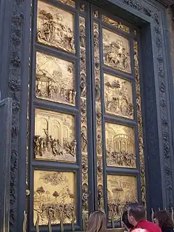 Do baptisteria vedou troje bronzové dveře, které jsou považovány za vrchol toskánského umění. Jižní bránu vyrobil kolem roku 1330 Andrea Pisano, žák významného pisánského sochaře Nicoly Pisana. Jsou na ní výjevy ze života Jana Křtitele a alegorie ctností. Tato brána je pokládána za jeden z posledních výtvorů gotického sochařství ve Florencii. Autorem severní brány je Lorenzo Ghiberti, považovaný za prvního významného florentského sochaře 15. století. Ghiberti zvítězil roku 1401 jako třiadvacetiletý v soutěži o zhotovení výplně této brány. Soutěže se zúčastnil například také o rok starší Filippo Brunelleschi, později významný renesanční architekt. Soutěžící měli do roka odlít jednu výplňovou tabuli dveří podle vzoru Andrea Pisana na námět Abrahám obětuje Izáka. Jak soutěžní návrh Ghibertiho, tak Bruneleschiho jsou dnes uloženy v Národním muzeu ve florentském Bargellu. Ghiberti pracoval na těchto dveřích s náměty z Nového zákona až do roku 1424. Nadšení zadavatelé mu poté svěřili práce také na třetí, východní bráně.