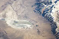 Pobřeží je bažinaté. Přibližně 20 km na východ leží město Barkol.
