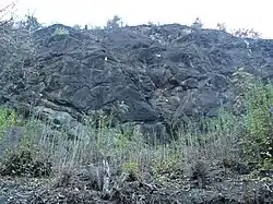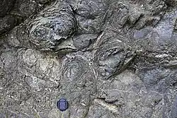 Tzv. chuchelské růžičky, několikacentimetrové kamenné útvary vzniklé kulovým rozpadem diabasu, vyvřelého na mořském dně -