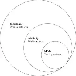 Substance neznamená žádnou látku ani poznatelnou skutečnost, nýbrž především myšlenkovou kategorii. Nekonečná substance má i nekonečně mnoho atributů, z nichž může lidský rozum poznávat jen dvě, totiž ducha jako „myslící věc“ (res cogitans) a látku jako „rozlehlou věc“ (res extensa) – Descartovy substance. Rozlehlost je identická s látkou, kdežto duch představuje jakoukoliv aktivitu mysli od smyslového vnímání přes imaginaci, afekty až po ideje).