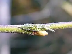 Samička klade vajíčka na listy živných rostlin, hlavně vrb. Vajíčka jsou olivově-zelená, až žlutavá, válcovitého tvaru.