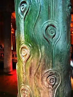 Nachází se v severozápadním rohu cisterny, základny dvou sloupů znovu využívají bloky vyřezávané s vizáží Medúzy. Původ dvou hlav není znám, i když se předpokládá, že hlavy byly přeneseny do cisterny poté, co byly odstraněny z budovy z pozdního římského období. Neexistuje žádný písemný důkaz, který by naznačoval, že byly dříve používány jako sloupové podstavce. Tradice říká, že bloky jsou orientovány bokem a převráceny, aby negovaly sílu pohledu Gorgonů.